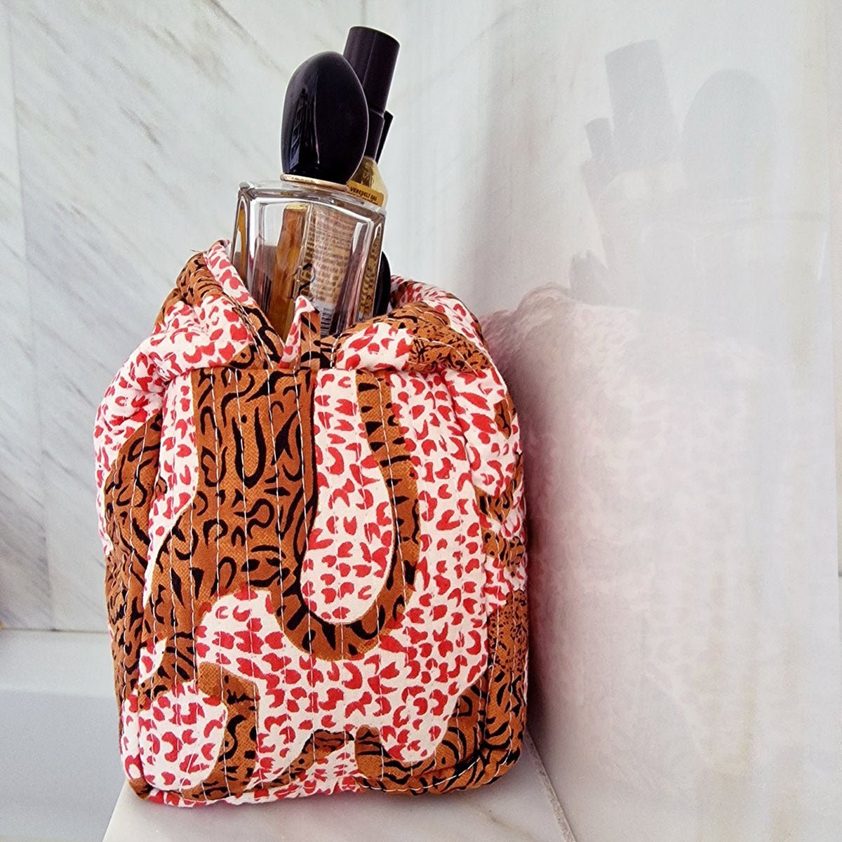 h.Leopard is een handgemaakte toilettas die speels design en dagelijks gemak combineert. Het compacte formaat past moeiteloos in je handtas en houdt essentials zoals lippenstift, handcrème en zonnebrand overzichtelijk en binnen handbereik. Elk exemplaar is met liefde met de hand gemaakt en daardoor uniek.