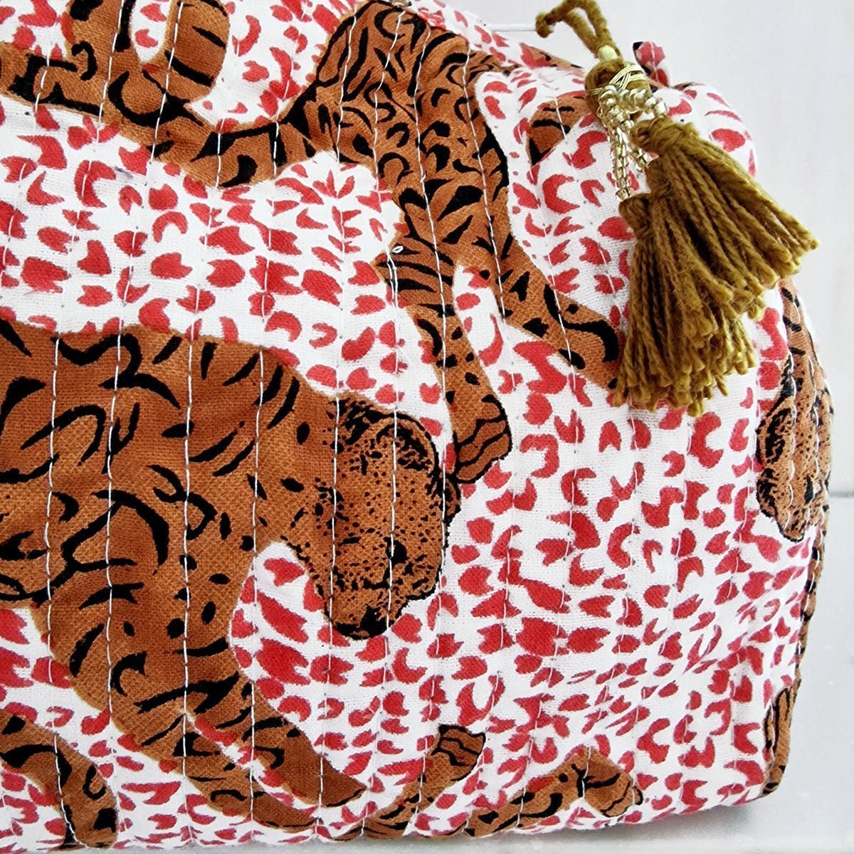 De tas wordt vervaardigd in Jaipur, India, van puur katoen en traditioneel handbedrukt via het blokdrukproces met houten stempels en natuurlijke, azo-vrije kleurstoffen. Het karakteristieke Kantha-borduurwerk en de handgemaakte kwastdecoratie aan de ritssluiting geven het tasje een ambachtelijke uitstraling. Geproduceerd onder eerlijke omstandigheden met minimale machine-inzet, wat water en energie bespaart. Volledig vegan en duidelijk anders dan massaproductie.